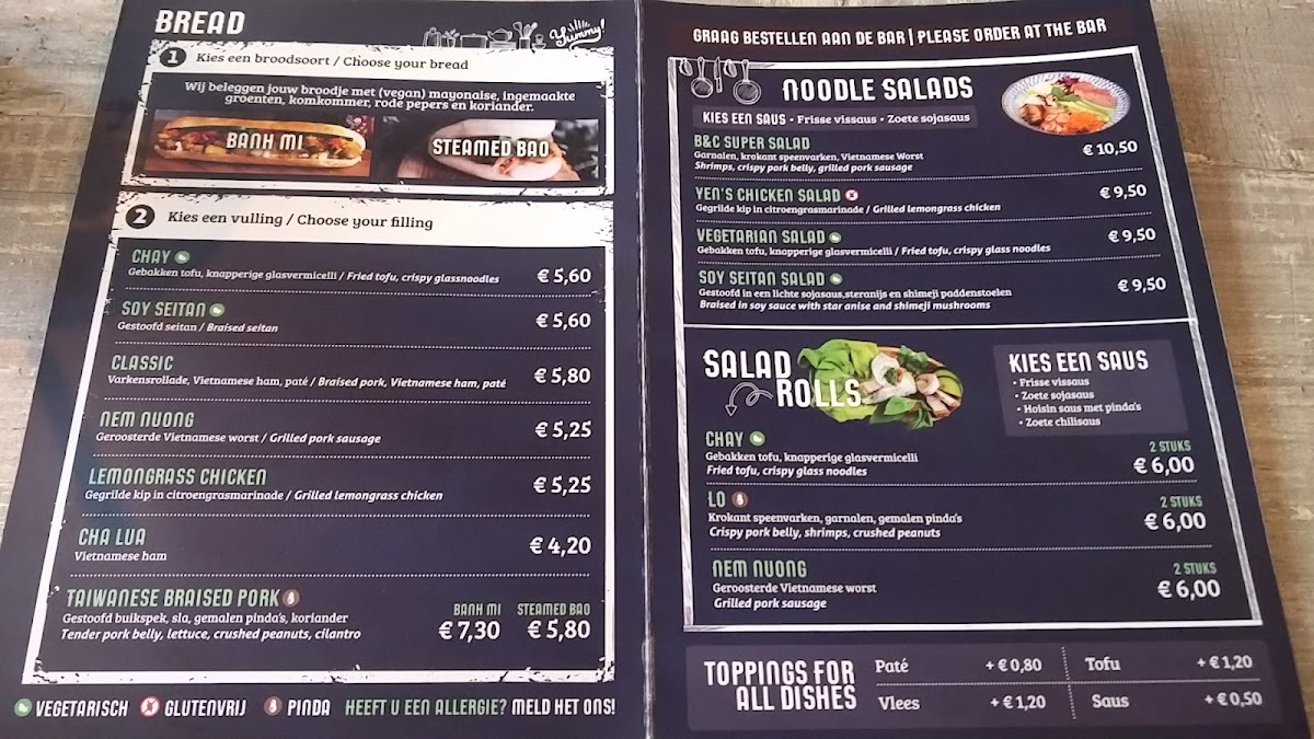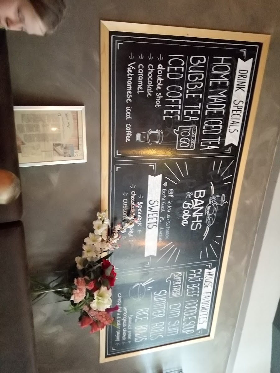 The menu at Restaurant Banhs And Boba Leeuwarden presents a concise yet well-balanced snapshot of Vietnamese-inspired comfort food and modern Asian street flavors, with a clear focus on freshness, variety, and accessibility. Drinks play a central role, led by Bubble Tea, Taro Milk Tea with Tapioca, Vietnamese Coffee, and Vietnamese Koffie, offering everything from creamy sweetness to bold, aromatic intensity. On the savory side, classic noodle dishes such as Pho Bo - Beef, Pho Bo & Summer Rolls, Chicken Ramen, and Chicken Wanton Soup deliver warming, familiar flavors that anchor the menu. The bao and banh mi selection adds a street-food edge, with highlights including Green Curry Lemon Chicken Bao, Steamed Bao Lemongras Chicken, Bao Seitan Stew, Banh MI Lemongrass Chicken, Chicken Banh Mi, and Stewed Seitan Banh MI, catering equally well to meat lovers and plant-based diners. Lighter options are thoughtfully represented through Super Salad, Chicken Salad, Slaatje Met Tofu, and Slaatje Met Seitan, making the menu feel inclusive and flexible. For something fresh and portable, Summer Rolls to Go and Summer Rolls Shrimp & Lo stand out as easy, flavorful choices that pair well with the broader menu. Overall, the selection feels cohesive and intentional, combining comforting classics with quick bites and refreshing drinks, making it easy to mix and match according to appetite while still maintaining a clear Vietnamese identity throughout the menu.